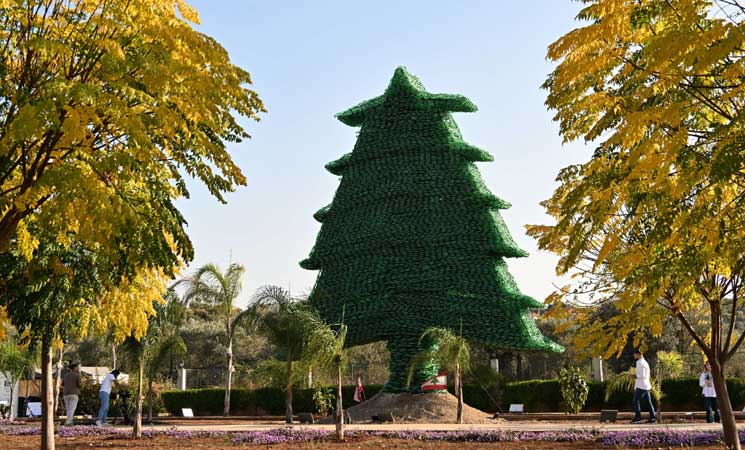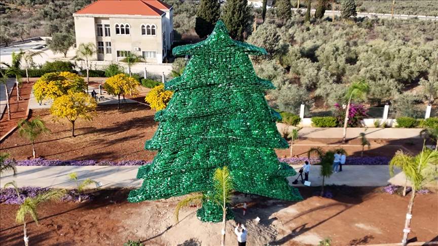 وتم جمع أكثر من 450 ألف قنينة بلاستيكية خضراء لبناء هذه الشجرة، التي يبلغ ارتفاعها 10 أمتار.