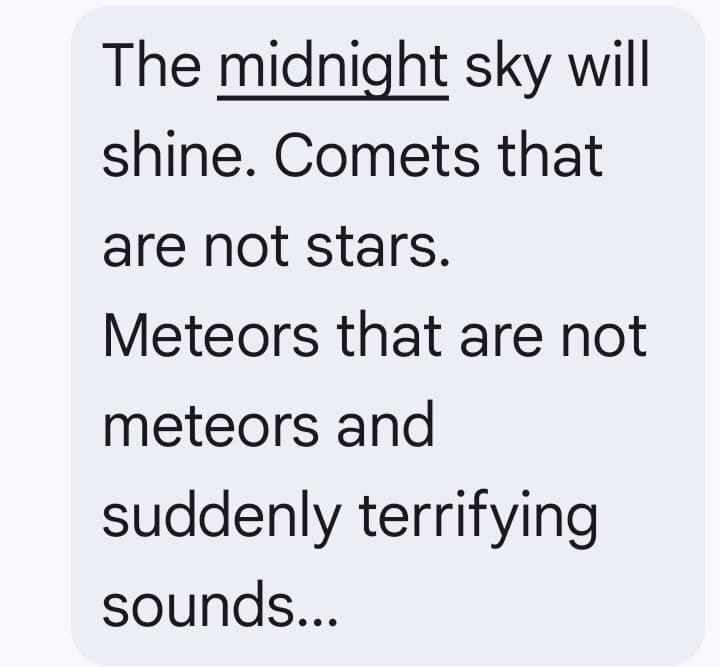 وقالت القناة 12 العبرية إن "آلاف الإسرائيليين تلقوا للمرة الثانية رسائل تهديد تفيد بأن "السماء ستضاء عند منتصف الليل.. مذنبات ليست نجوما.. نيازك ليست كالنيازك.. وفجأة أصوات مرعبة".