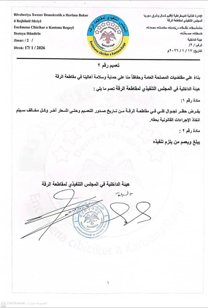 لمقاطعة الرقة ما يلي: يفرض حظر تجوال كلي في مقاطعة الرقة، من تاريخ صدور التعميم، وحتى إشعار آخر، وكل مخالف سيتم اتخاذ الإجراءات القانونية بحقه".