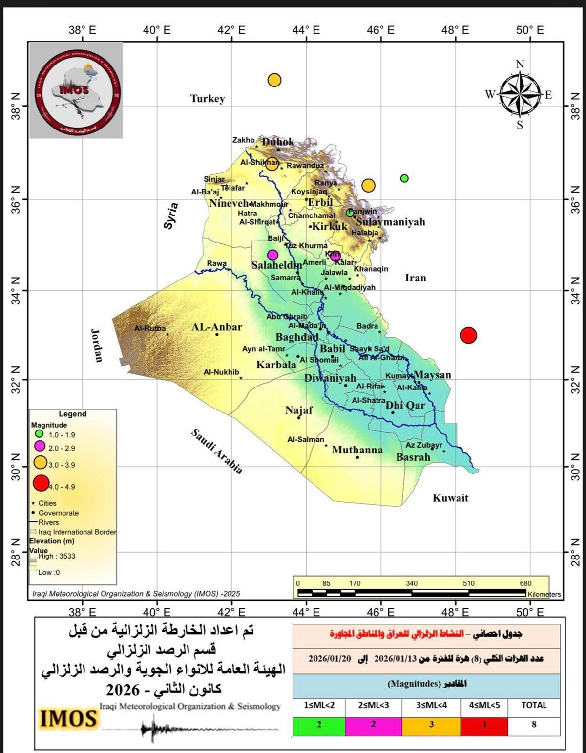 ، ان "قسم الرصد الزلزالي سجل 8 هزات أرضية للفترة من 13 لغاية 20 كانون الثاني"، مبينة ان "4 من هذه الهزات وقعت داخل الأراضي العراقية".