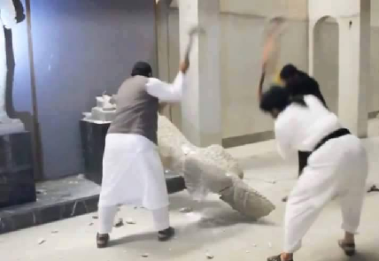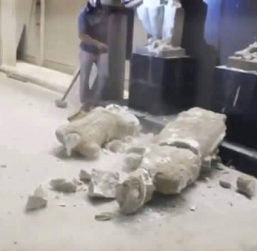 الفيديو الذي نشره التنظيم العملية الاجرامية التي طالت عدد من التماثيل التاريخية والنادرة بإستخدام الأدوات اليدوية والكهربائية. ومن بينها تمثال بوذا النادر والوحيد من نوعه إضافة الى بعض القبور والأضرحة. كما دمّروا التمثال الآشوري الكبير الذي يعتبر من أقدم الآثار ويعود تاريخه الى القرن 19 ق.م، وقاموا بتحطيم الثور المجنح الخاص في