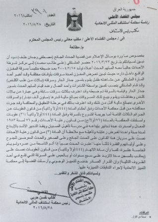 وقالت المحكمة بالوثيقة التي قدمتها للقضاء عن الحدث الجانح (مصطفى وجدان خلف)، وتلقت