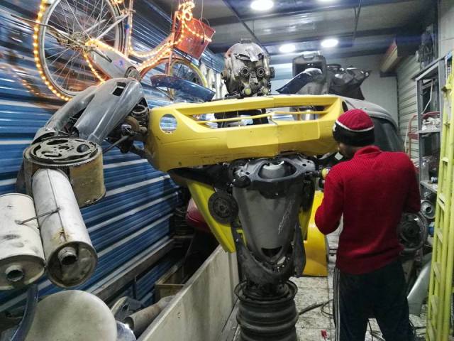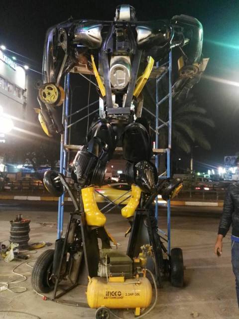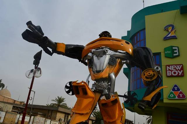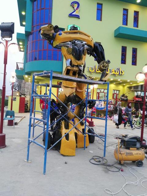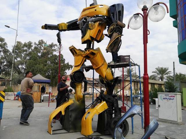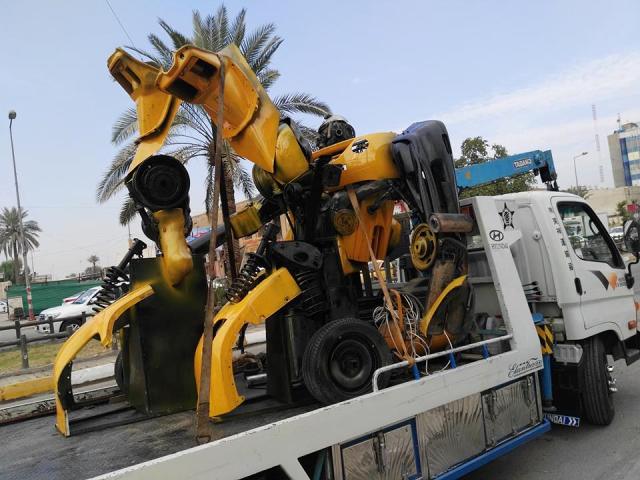 عراقي محترف وبمساعدة من زملاءه .. يتمكن من صنع شخصية "بامبل بي" الشهيرة من الخردة والسكراب بنسخة عراقية، لتكون لوحة جميلة في الشارع.