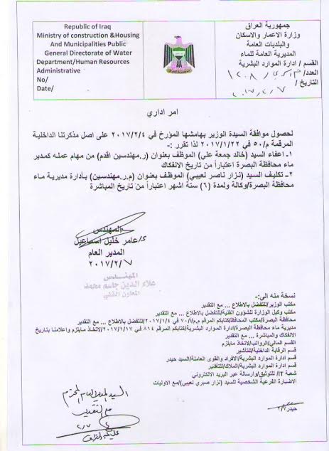 على نسخة منه، إلى أن "لحصول موافقة الوزيرة بهامشها المؤرخ في (4 شباط 2017) على أصل مذكرتنا الداخلية في (22 كانون الثاني 2017) فقد تقرر إعفاء (خالد جمعة علي) الموظف بعنوان (رئيس مهندسين أقدم) من مهام عمله كمدير ماء