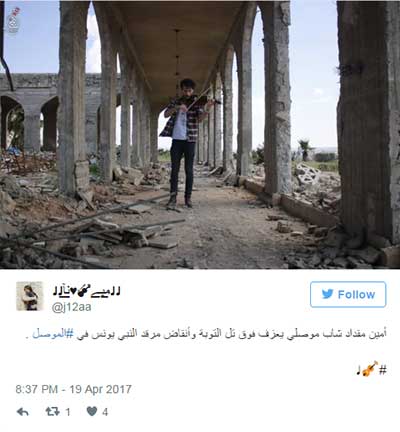 يعزف ألحانا ألفها سرًا عندما كان يعيش تحت حكم داعش، ظل دوي الانفجارات والأعيرة النارية من الأحياء الغربية في الموصل يتصاعد حيث لا تزال القوات العراقية المدعومة من