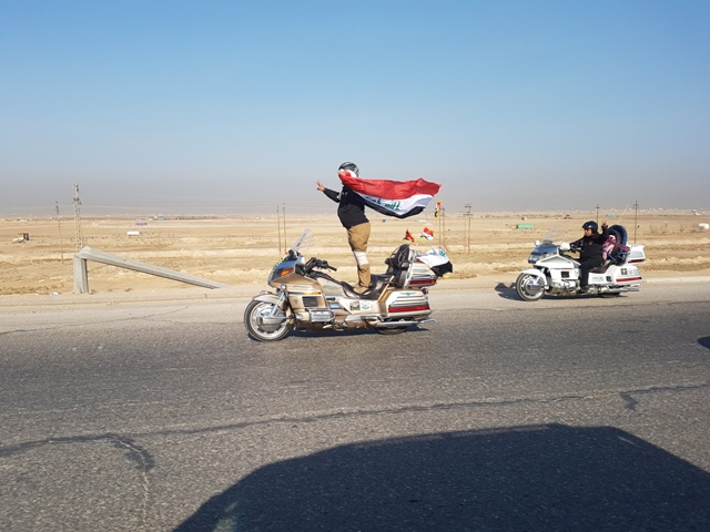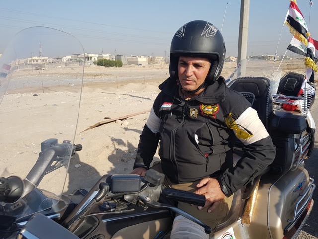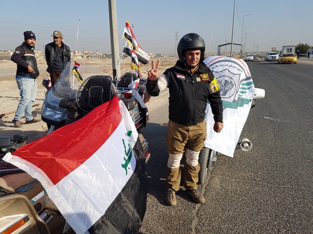 ، إن "الرحلة أطمح من خلالها الى دخول موسوعة (غنيس) للأرقام القياسية كأول انسان يقطع مسافة أكثر من 250 كم على دراجة نارية يقودها وهو واقف فوقها، في حين أن الرقم القياسي المسجل سابقاً هو 60 كم"، مبيناً أن "العلم العراقي حملته بيدي على امتداد مسار الرحلة من