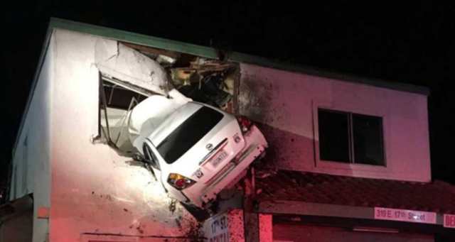كل قواعد المرور، والطبيعة أيضا، عندما طارت سيارته في الهواء واخترقت جدار الطابق الثاني في مبنى على جانب الطريق.