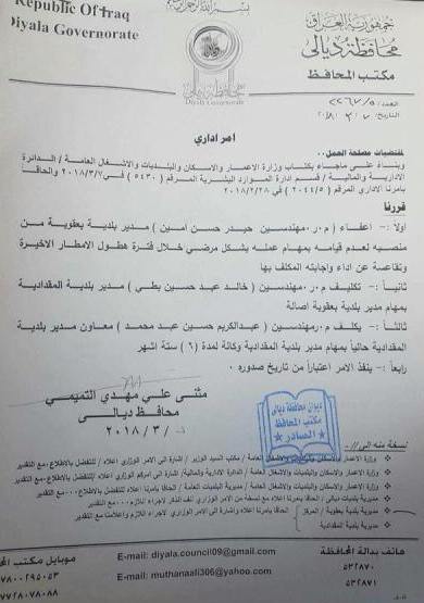 ، "اصدارنا قرارا باعفاء مدير بلدية بعقوبة