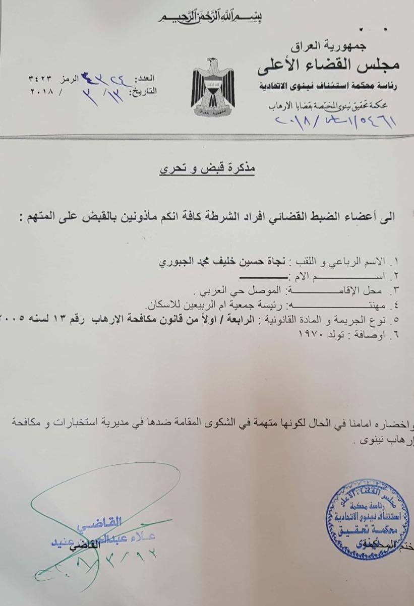 بالوثيقة.. صدور مذكرة قبض بحق رئيسة جمعية للأسكان في الموصل بتهمة الارهاب