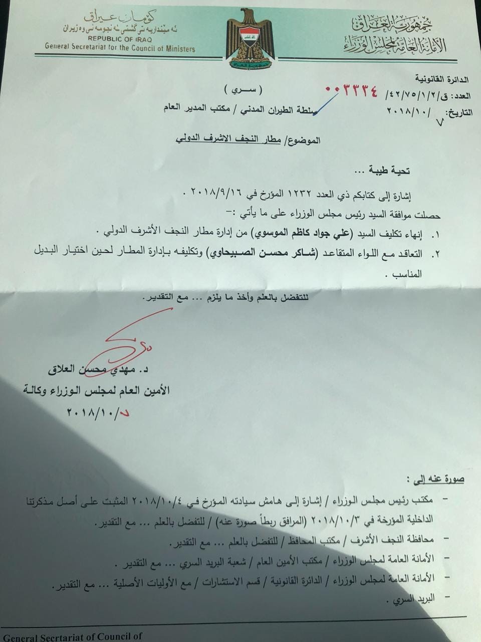 بالوثيقة..تكليف الصبيحاوي لادارة مطار النجف لحين اختيار البديل المناسب
