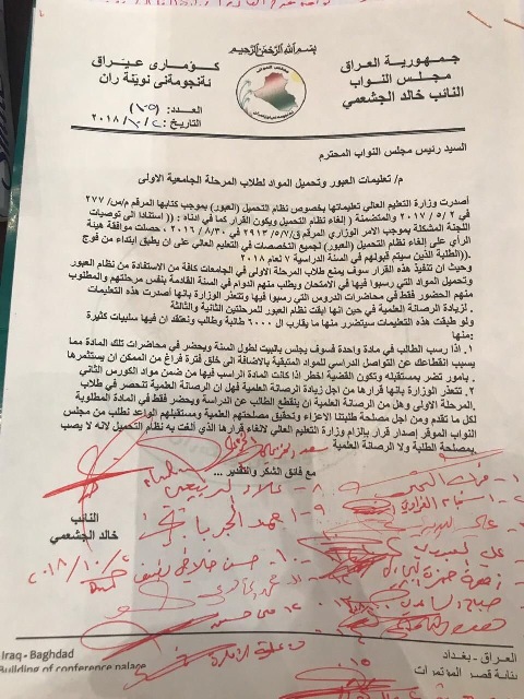 ، نسخة منه، إنه "بناءً على الطلب المقدم من النائب خالد الجشعمي، وافق
