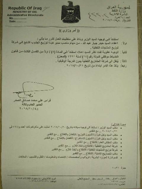 بالوثيقة.. اعفاء مدير هيئة توزيع الجنوب بشركة توزيع المنتجات النفط