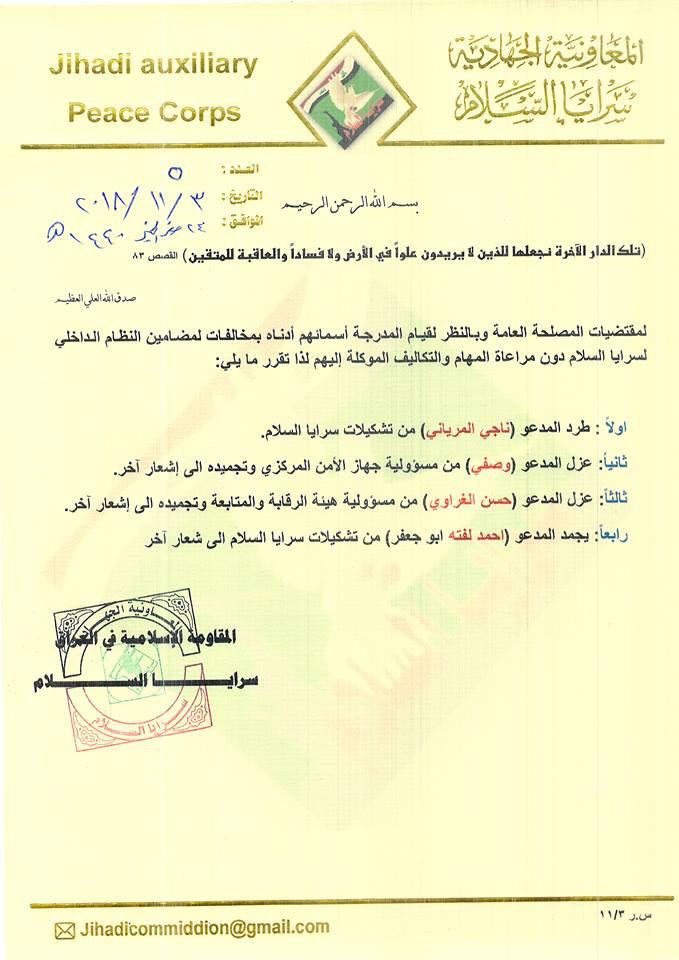 بالوثائق.. سرايا السلام تقرر "طرد" اربعة من عناصرها وتصدر توجيهات عدة