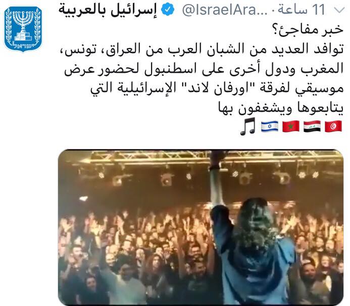 نشر الحكومة الإسرائيلية عبر حسابها الرسمي على موقع "تويتر"، مقطع فيديو يسجل لحظات من حفل موسيقي أقامته فرقة إسرائيلية في مدينة إسطنبول التركية.