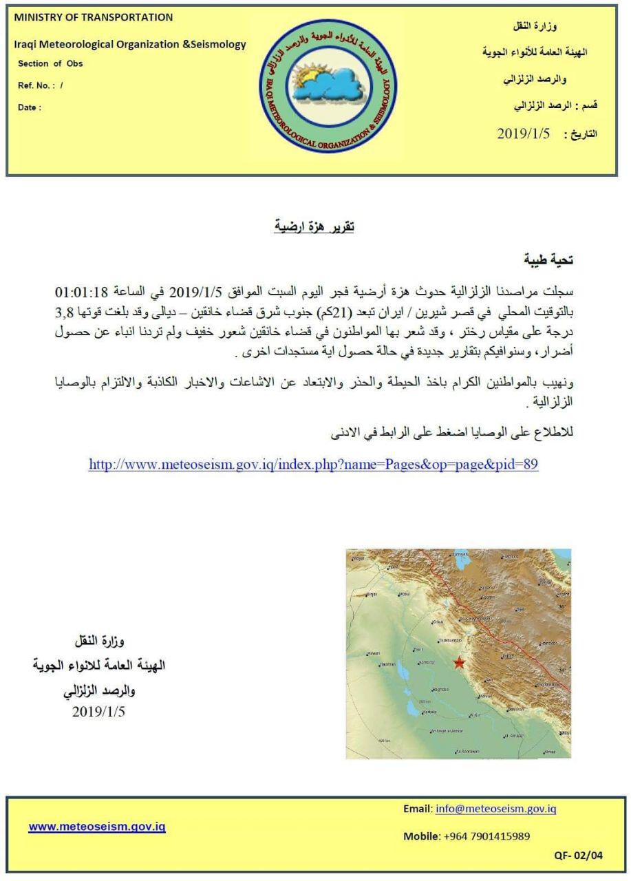خانقين بديالى"، مبينا ان "قوتها بلغت 3,8 درجة على مقياس رختر".