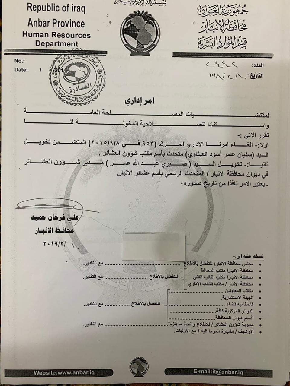 بالوثيقة.. محافظ الانبار يعفي العيثاوي من منصب المتحدث باسم مكتب شؤون العشائر