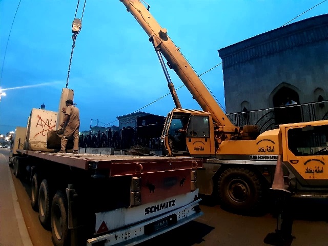 ، صوراً لرفع الكتل الكونكريتية من محيط الحضرة القادرية وسط العاصمة بغداد.