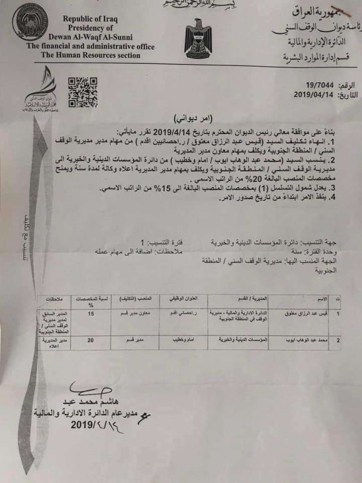 بالوثيقة.. تكليف مدير جديد لإدارة الوقف السني في الجنوب بالوكالة