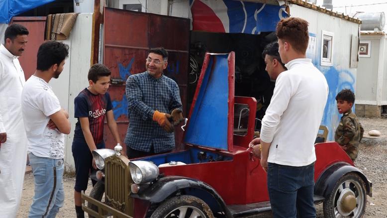 -أحد النازحين في المخيم- إنه "من خلال هذه السيارة الكلاسيكية استطاع هو وغيره من قاطني المخيم تعلم السياقة مجانا".