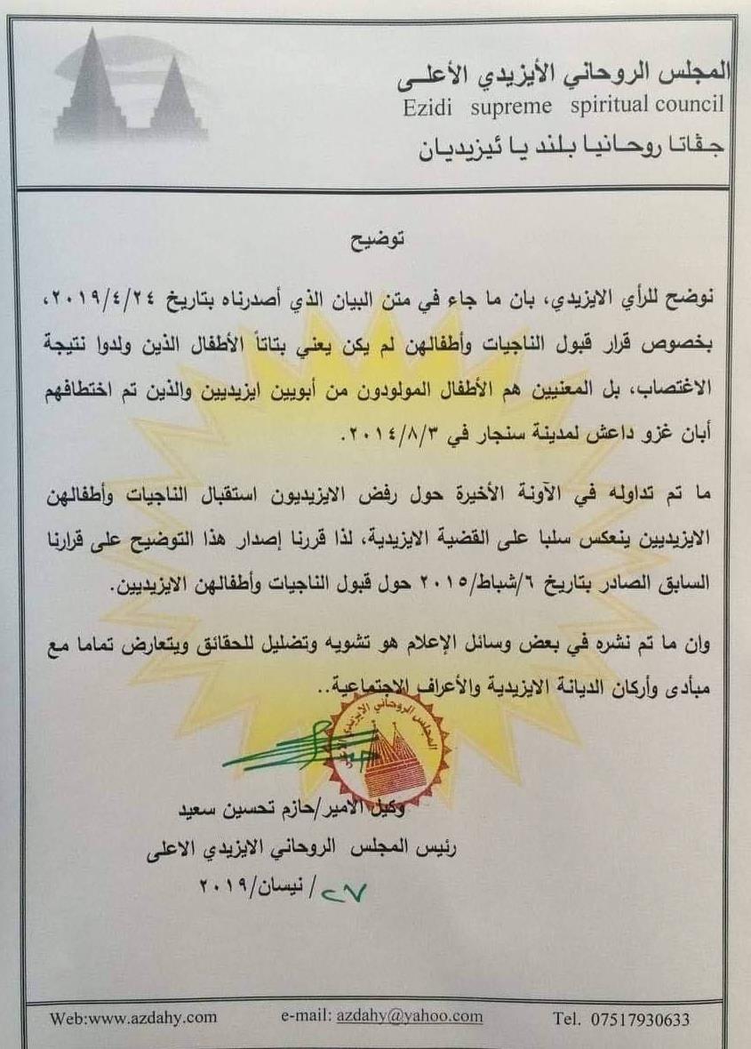 بالوثيقة.. مجلس ايزيدي يوضح حقيقة رفض استقبال الناجيات الايزيديات واطفالهن