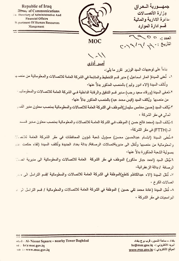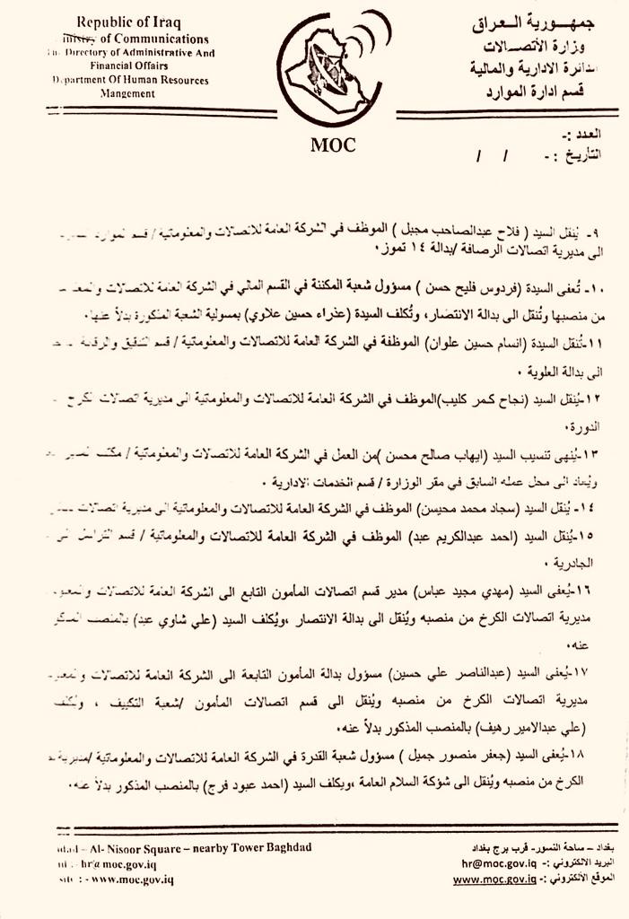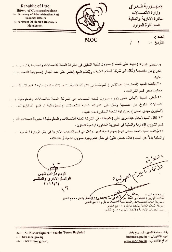 وتضمنت الوثائق تغييرات وظيفية بين مدراء الاقسام والشعب والموظفين في شركات الوزارة، بعيداً عن الخبرة والمهنية والكفاءة دون ان يبين الاسباب، بحسب مراقبين.