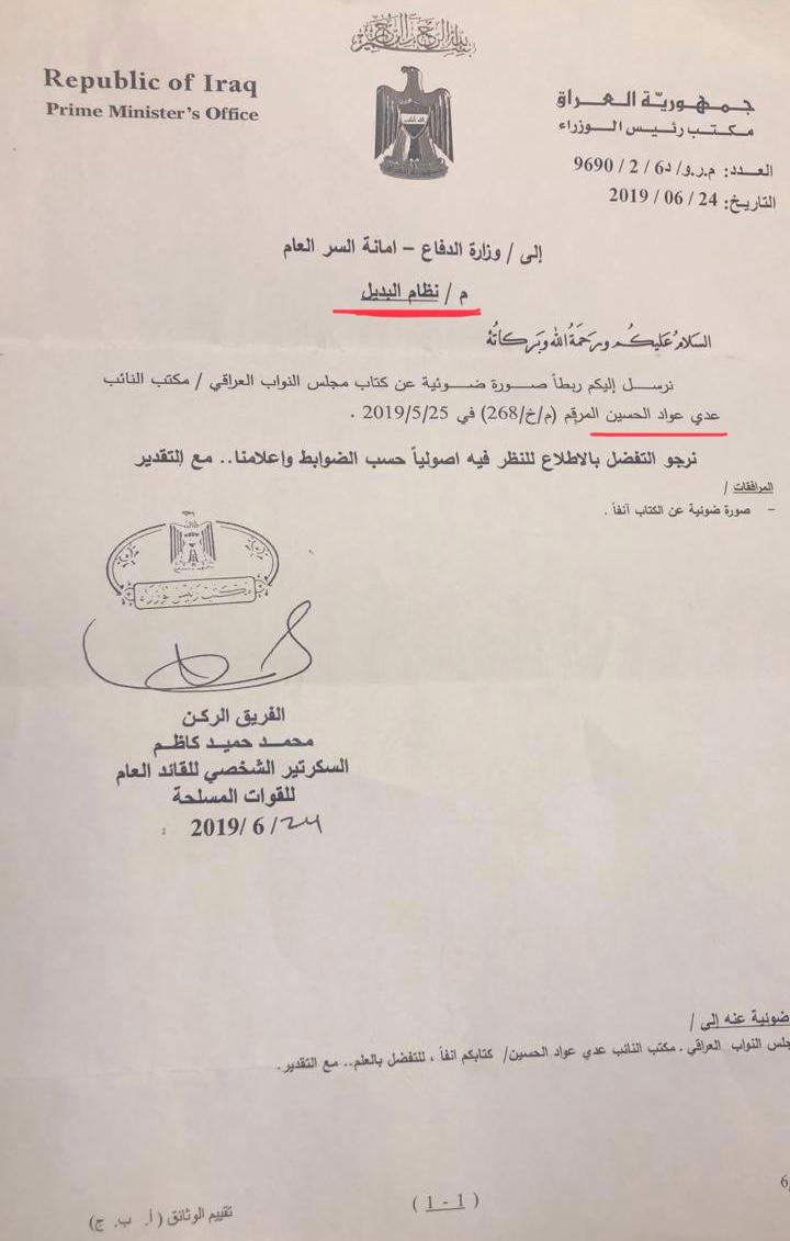بالوثيقة.. مكتب عبد المهدي يخاطب الدفاع باعتماد نظام البديل