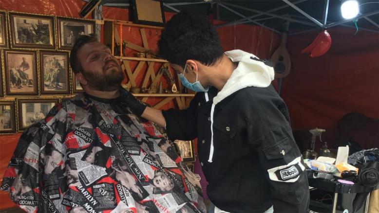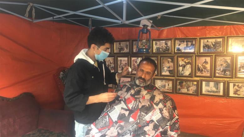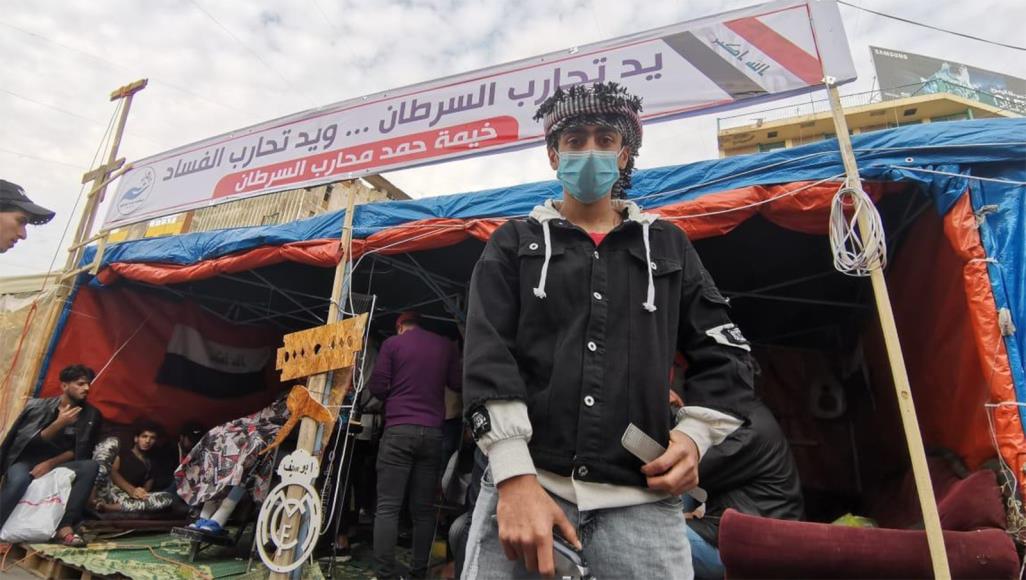 تمتلئ ساحة التحرير وسط بغداد، بخيم المعتصمين الذي نظموا أنفسهم على شكل ‏مجموعات، بينهم طلاب الجامعات والمهن المختلفة، فضلًا عن المسعفين والنشطاء ‏والقادمين من محافظات أخرى، إضافة إلى خيمة بات يعرفها الجميع ويقصدونها للحصول على حلاقة مجانية، إنها "خيمة حمد محارب ‏السرطان".