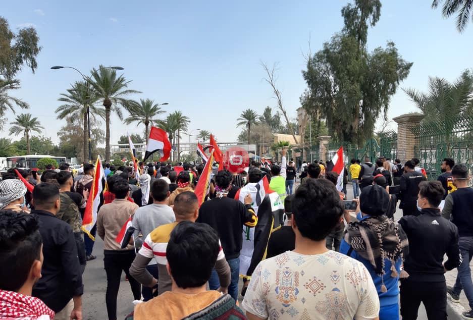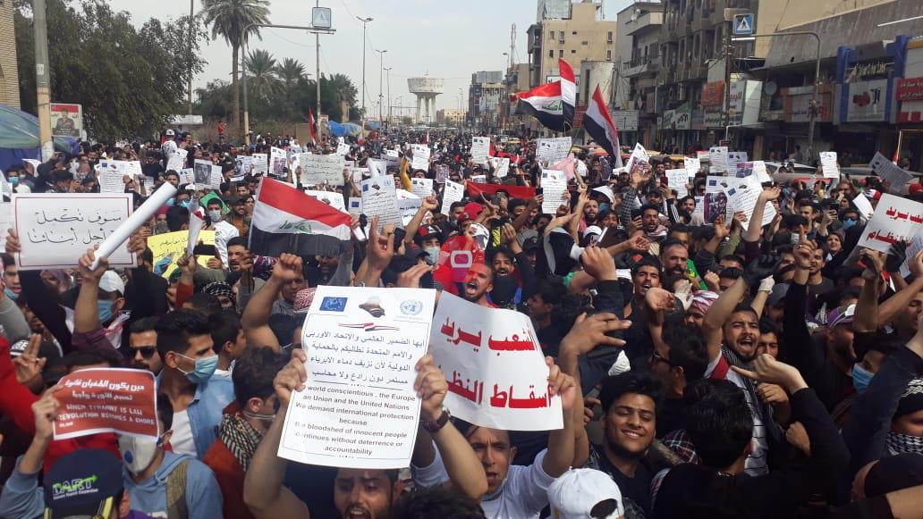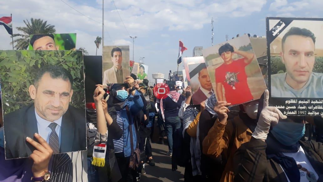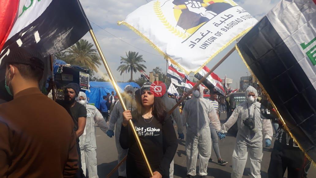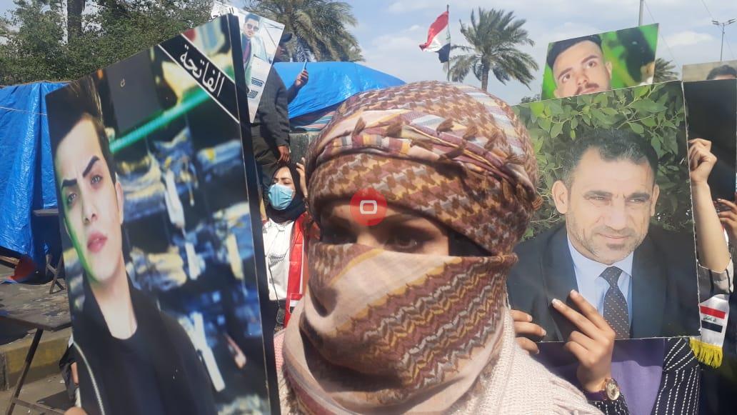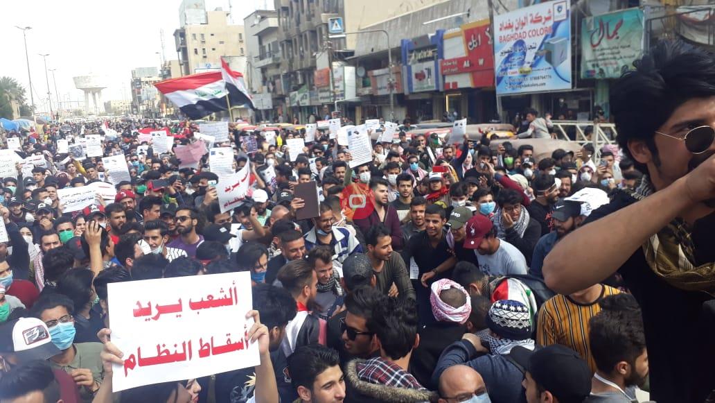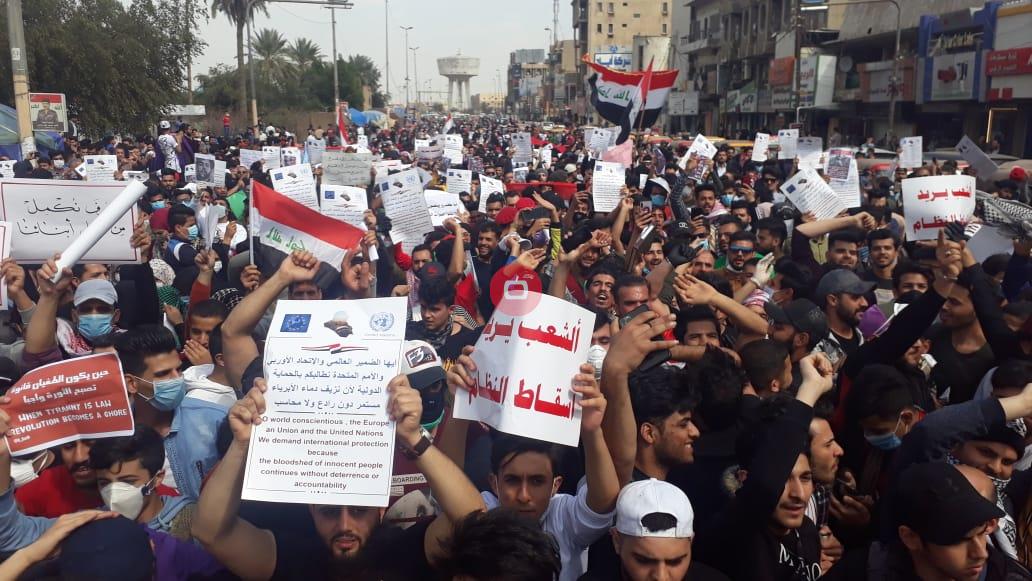 فيما رفع المتظاهرون عدد من اللافتات والاعلام العراقية اضافة الى صور الشهداء الذين قتلوا خلال التظاهرات.