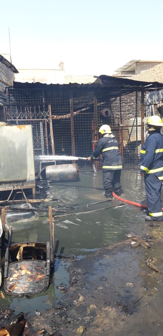 بالصور.. الدفاع المدني يخمد حريقاً نشب داخل أربع "مولدات أهلية" في البصرة