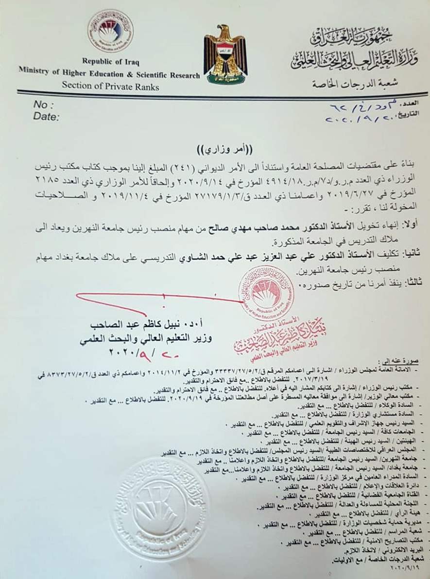 وزير التعليم يكلف الشاوي رئيسا لجامعة النهرين