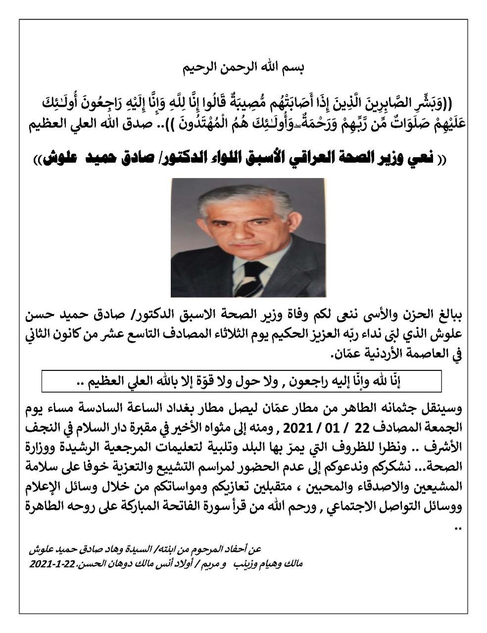 علوش، اليوم الجمعة، وفاة والدهم في العاصمة الاردنية عمان.