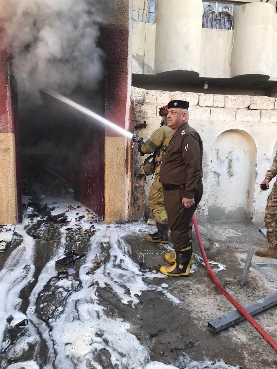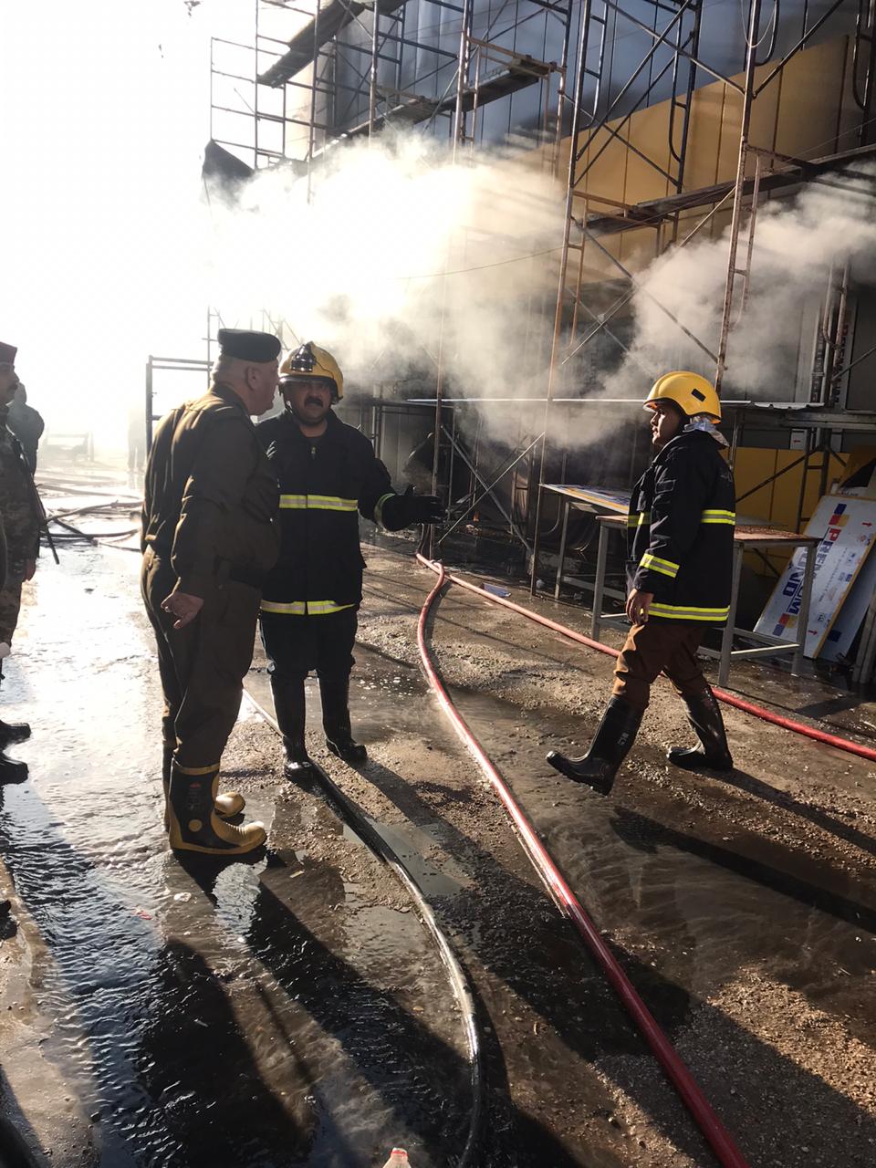 حيث اخلت فرق الدفاع المدني العاملين داخل المجمع ثم طوقت النيران لمنع امتداد السنتها الى الابنية المجاورة لتنفذ