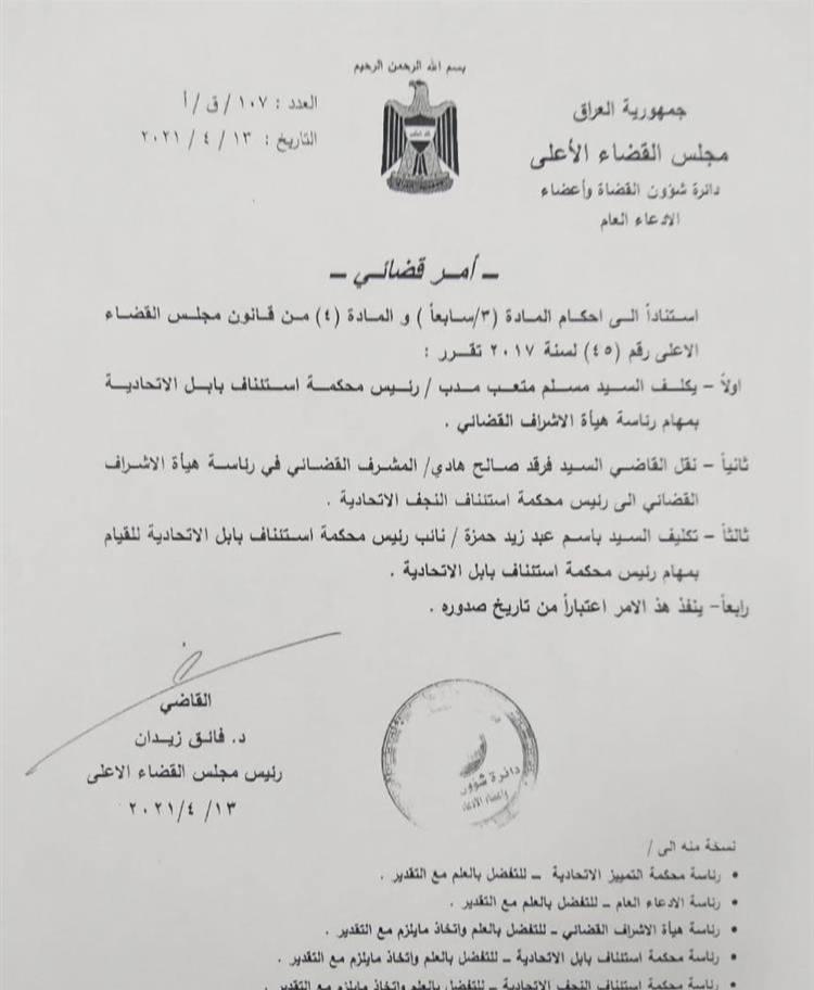 بالوثيقة: تغييرات بمناصب عليا في مجلس القضاء الاعلى