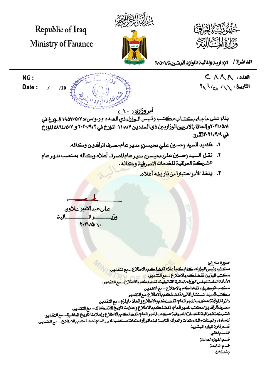 بالوثيقة.. وزير المالية يأمر بفك يد مدير عام مصرف الرافدين وكالة