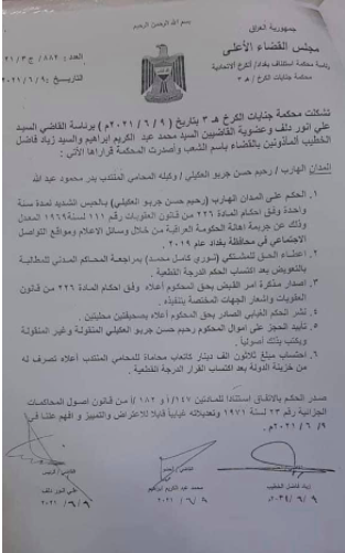 بالسجن المشددة لمدة سنة وتأييد مصادرة امواله المنقولة وغير المنقولة لادانته بإهانة الحكومة عبر مواقع التواصل الاجتماعي.