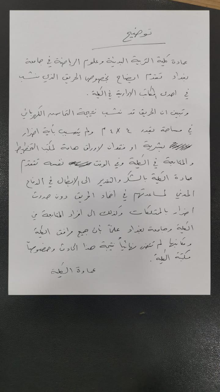 ، إن "الحريق نشب نتيجة تماس كهربائي ولم يتسبب بأية أضرار بشرية أو فقدان أوراق مهمة لمكتب التخطيط والمتابعة في الكلية".