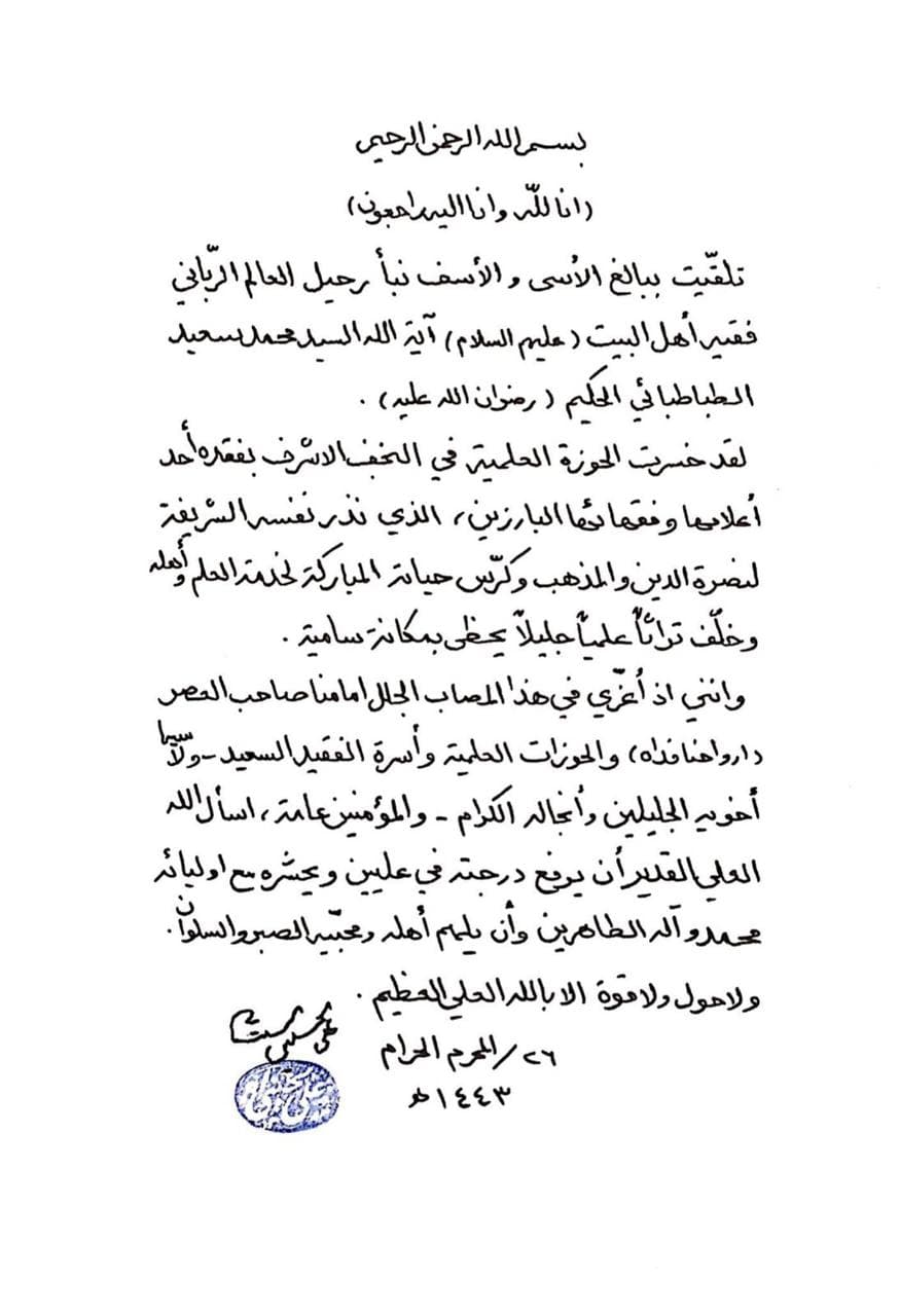 لخدمة العلم واهله وخلف تراثا علميا جليلا يحظى بمكانة سامية، واننى اذ اعزي في هذا المصاب الجلل امامنا صاحب العصر (ارواحنا فداه) والحوزات العلمية وأسرة الفقيد السعيد – ولاسيما اخويه الجليلين وانجاله الكرام ـ والمؤمنين عامة، اسأل اللہ العلي القدير أن يرفع درجته في عليين ويحشره مع اوليائه محمد وآله الطاهرين وأن يلهم اهله ومحبيه الصبر والسلوان ،ولاحول ولاقوة الابالله العلي