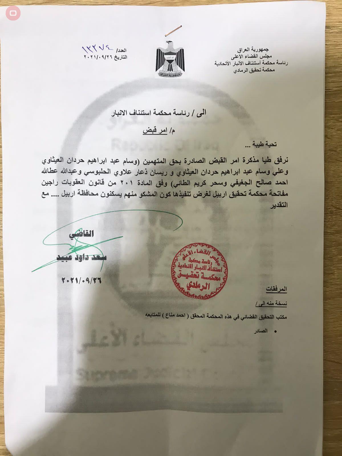 ، "نرفق طيا مذكرة امر القبض الصادر بحق المتهمين (وسام