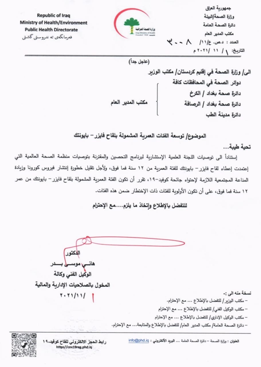وزيادة المناعة المجتمعية اللازمة لاحتواء الفايروس تقرر أن تكون الفئة العمرية المشمولة بلقاح فايزر – بايونتك من عمر 12 سنة فما فوق".