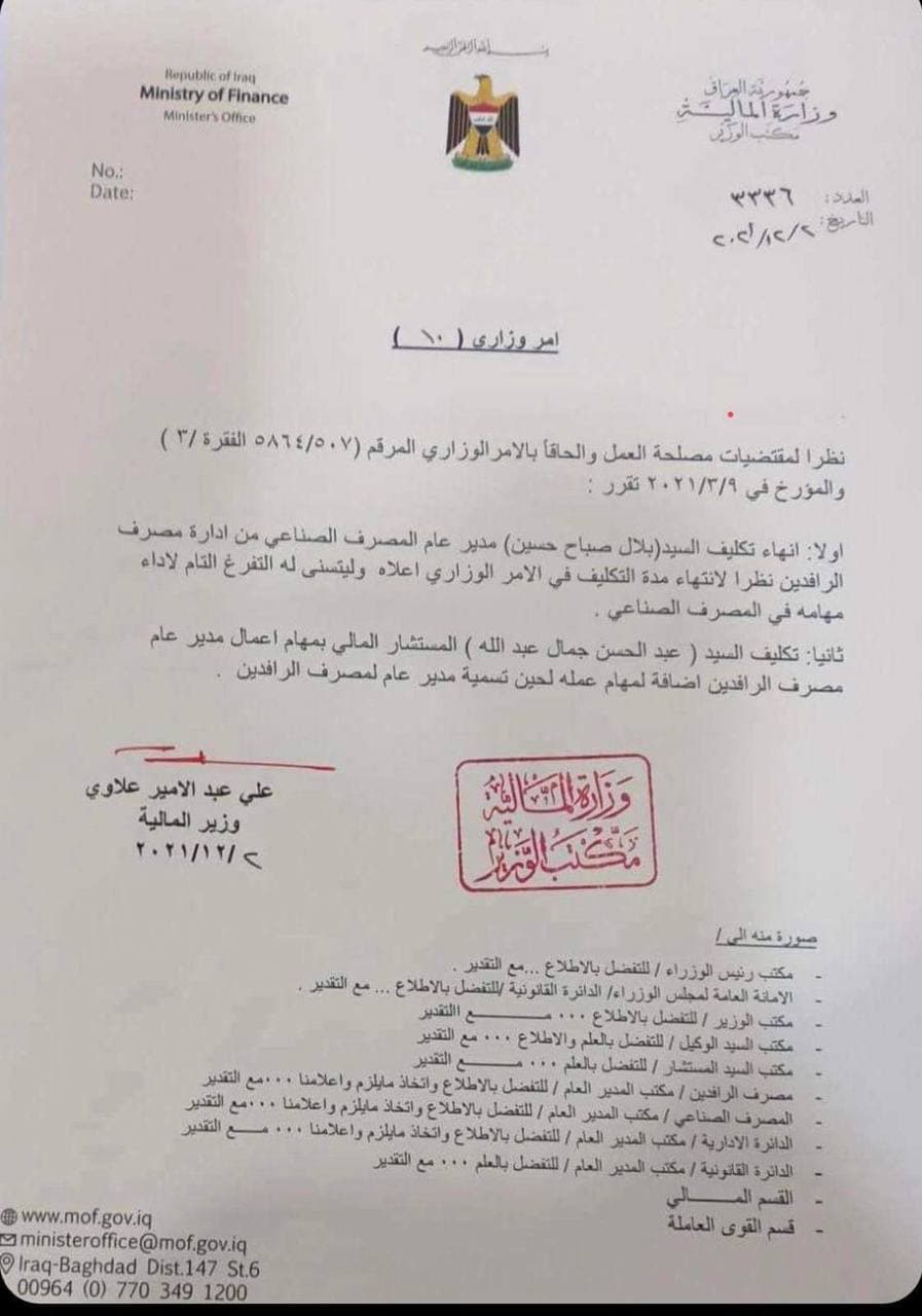 ثانيا: تكليف عبد الحسن جمال عبد الله المستشار المالي بمعام اعمال مدير عام مصرف الرافدين اضافة الى مهام عمله لحين تسمية مدير عام لمصرف الرافدين".