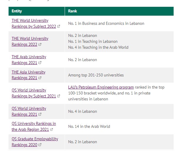 في العراق وريادته في المنطقة، حيث ان الجامعة على قائمة أفضل الجامعات على المستوى اللبناني، العربي والعالمي كما يظهر في الجدول التالي: