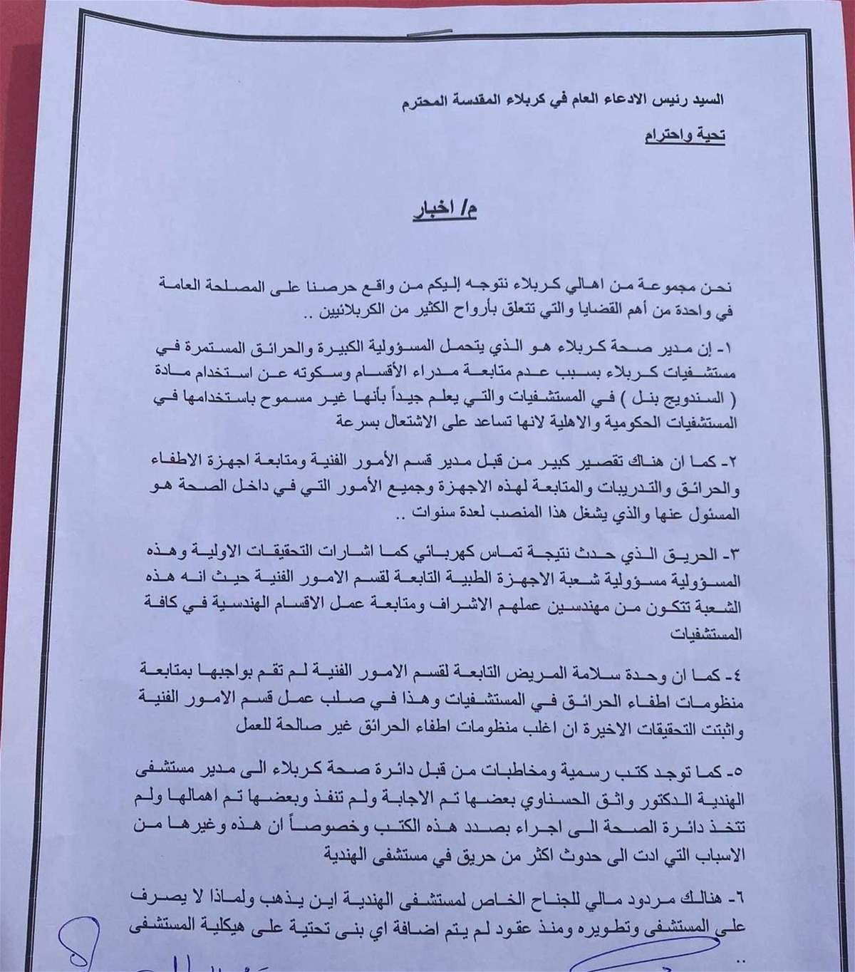 هو من يتحمل المسؤولية الكبيرة عن الحرائق المستمرة في مستشفيات كربلاء بسبب عدم متابعة مدراء الأقسام وسكوته عن استخدام (السندويج بنل) في المستشفيات والتي يعلم جيداً أنها غير مسموح باستخدامها في المستشفيات سواء الحكومية أو الأهلية؛ لأنها تساعد على الاشتعال بسرعة".