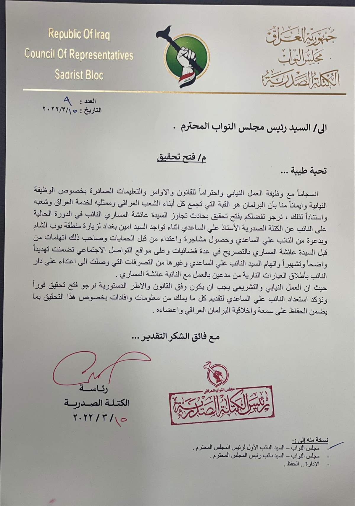 طالبت الكتلة الصدرية، اليوم الثلاثاء، بالتحقيق مع النائب