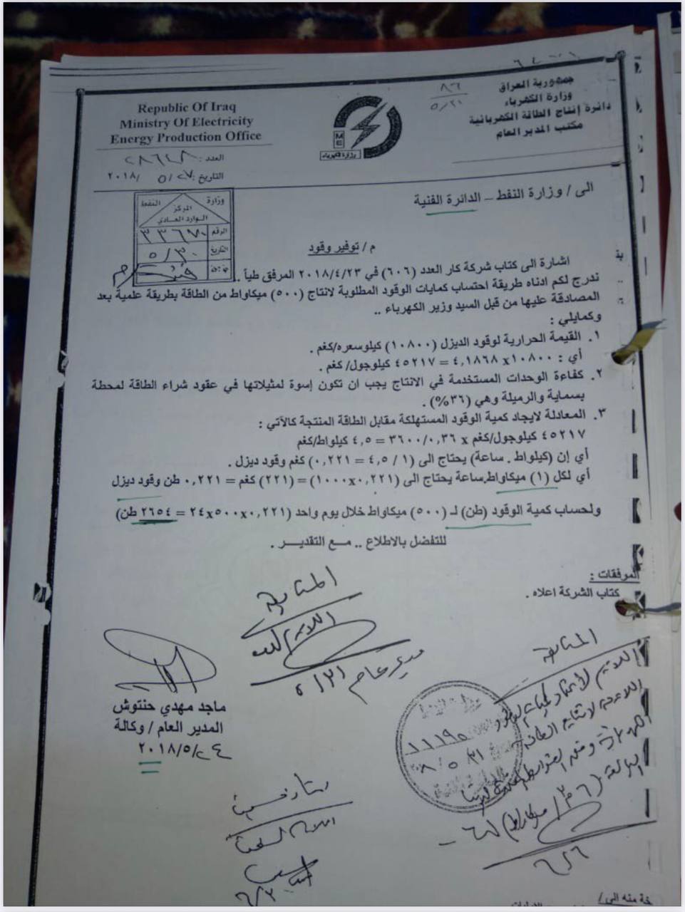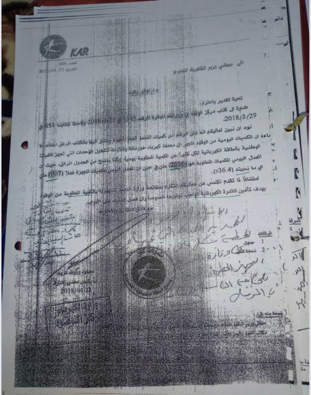 الديزل الملوث المخالف للمواصفات دون موافقات رسمية، وحسب ما ورد في كتاب الدائرة الفنية في 3 / 9 / 2018 المرفق ربطاً، ولم تتخذ الوزارة أي إجراء لتعويض الضرر بالمال العام، الذي نتج عن حرق هذه الكميات من مادة الديزل، وبدلاً من استقطاع كلفة هذه المادة قامت وزارة النفط بتجديد كافة المستحقات المالية لشركة كار وذلك بتزويدها بمنتوج النفط الأسود، وبسعر البورصة العالمية، وبعد أن تمَّ طرح كلفة النقل وتخفيض السعر بمقدار عشرة في المئة عن سعر البورصة، وحسب ما ورد في كتاب شركة توزيع المنتجات النفطية، في 9 / 9 / 2018، المرفق ربطاً".
