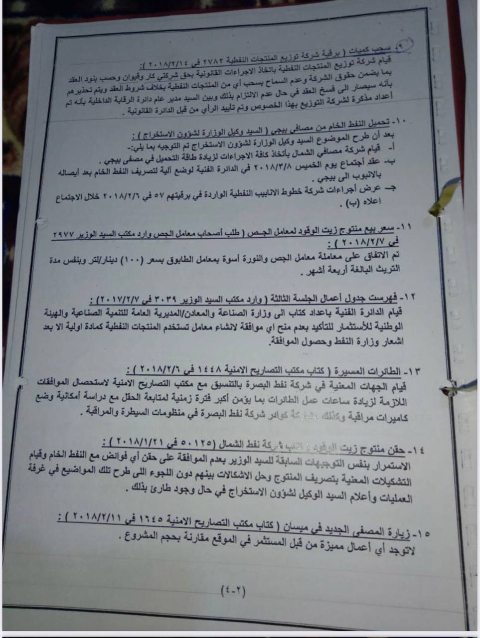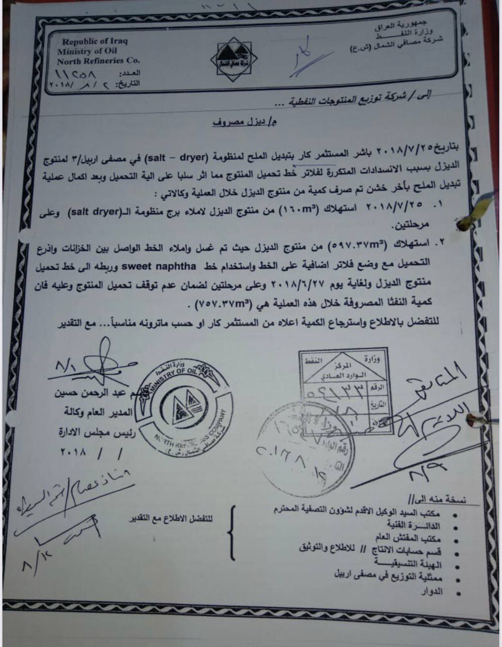 مكتب المفتش العام وحسب كتابه في 16 / 5 / 2018، بتوجيه شركة توزيع المنتجات النفطية باتخاذ الإجراءات الأصولية ضد هذه الشركة كونها مستمرة بسحب المنتجات النفطية دون موافقات أصولية".