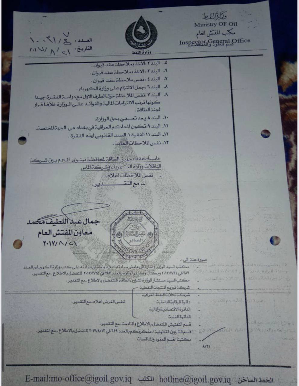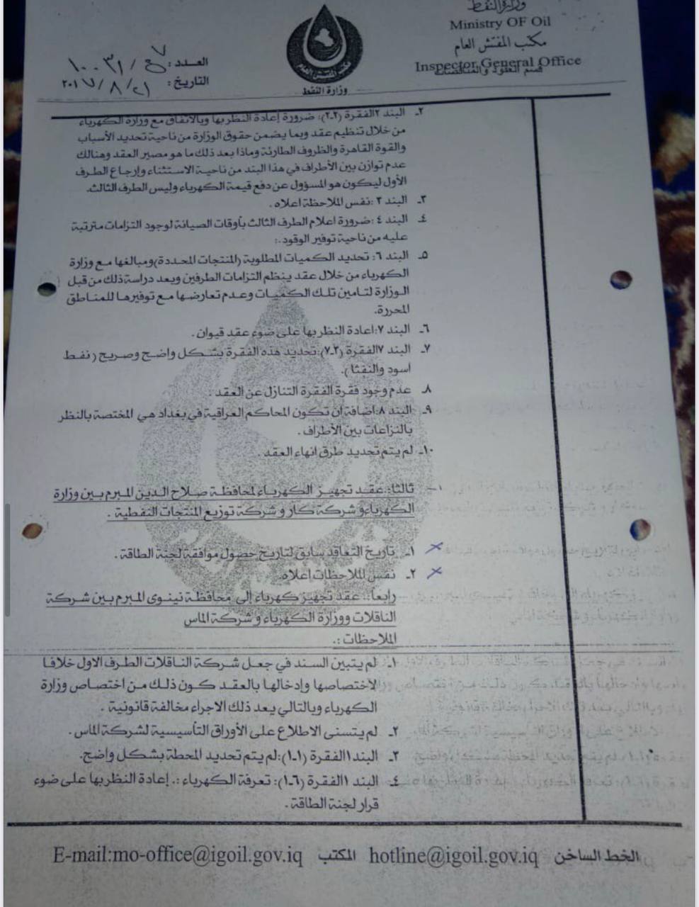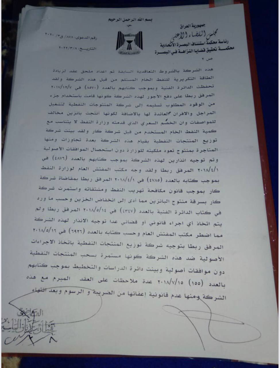 مكتب المفتش العام، في وزارة النفط، في 26 / 11 / 2017، المرفق صورته ربطاً، ولقد قامت الجهات المعنية في وزارة النفط على الرغم من عدم التزام هذه الشركة بالشروط التعاقدية السابقة، تم إعداد ملحق عُقد لزيادة الطاقة التكريرية للنفط الخام، المستلم من قبل هذه الشركة".