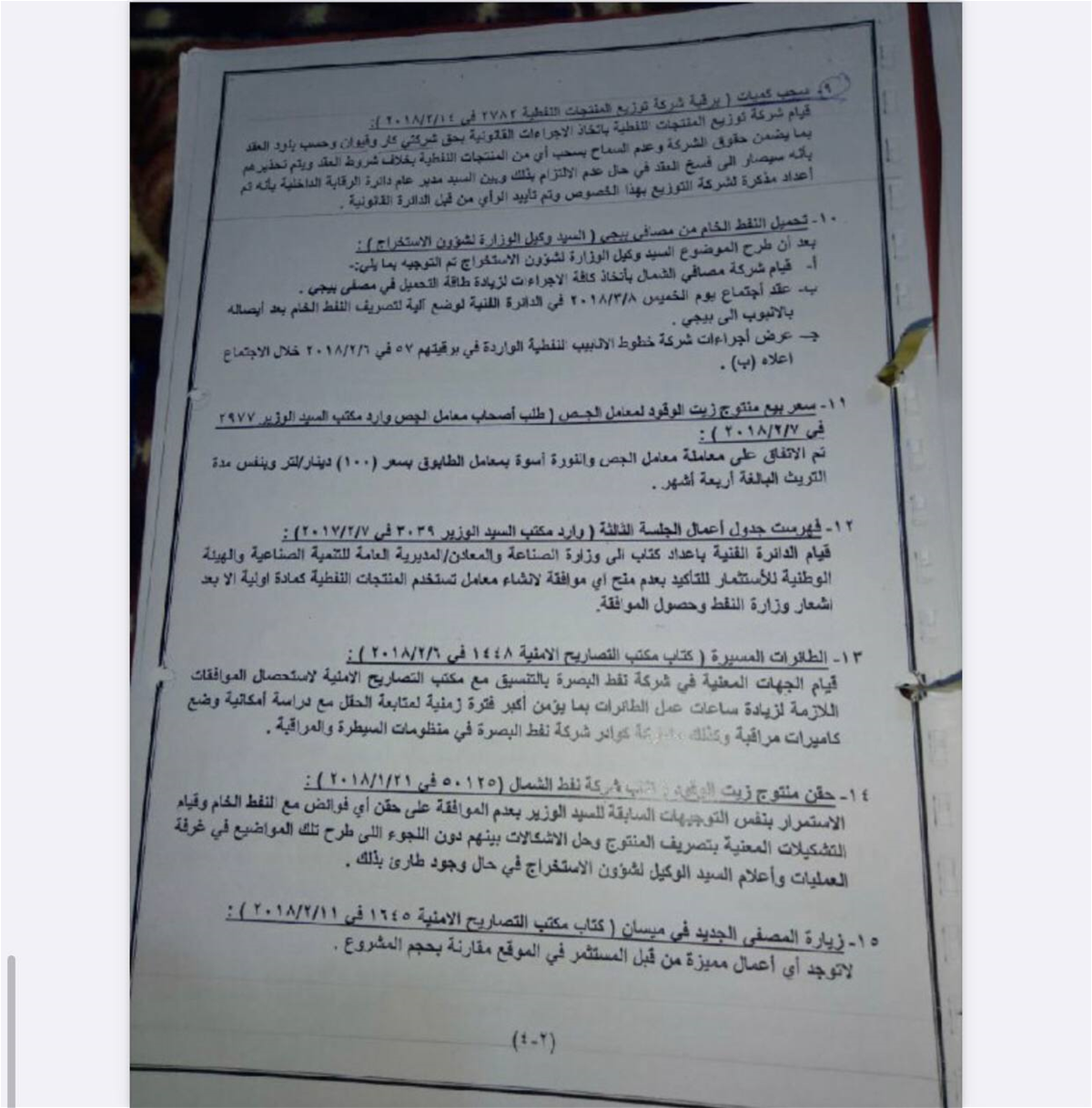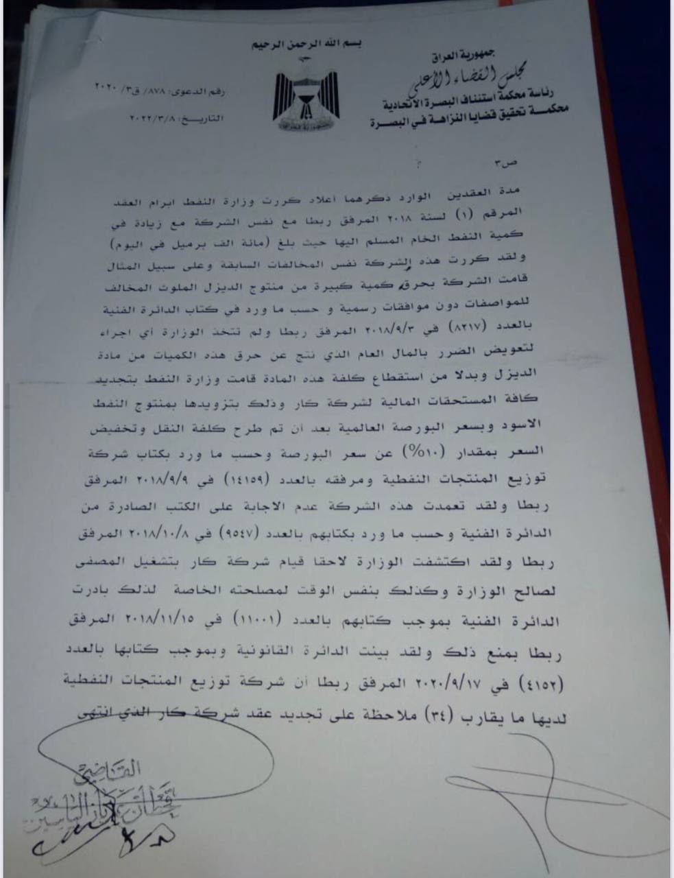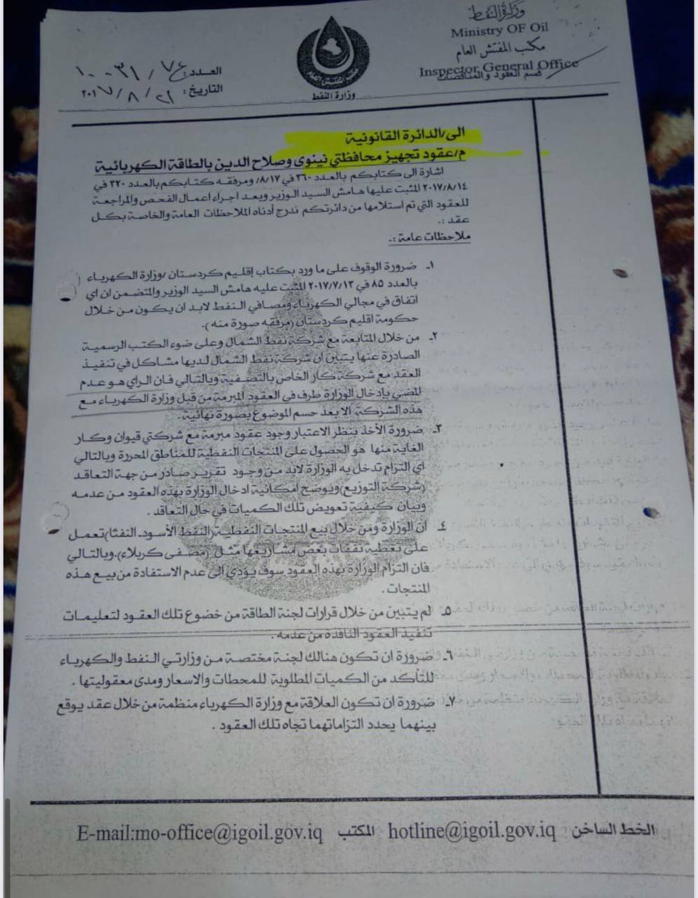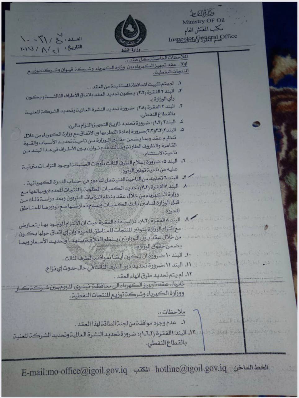 مكتب المفتش العام، في وزارة النفط، في 26 / 11 / 2017، المرفق صورته ربطاً، ولقد قامت الجهات المعنية في وزارة النفط على الرغم من عدم التزام هذه الشركة بالشروط التعاقدية السابقة، تم إعداد ملحق عُقد لزيادة الطاقة التكريرية للنفط الخام، المستلم من قبل هذه الشركة".