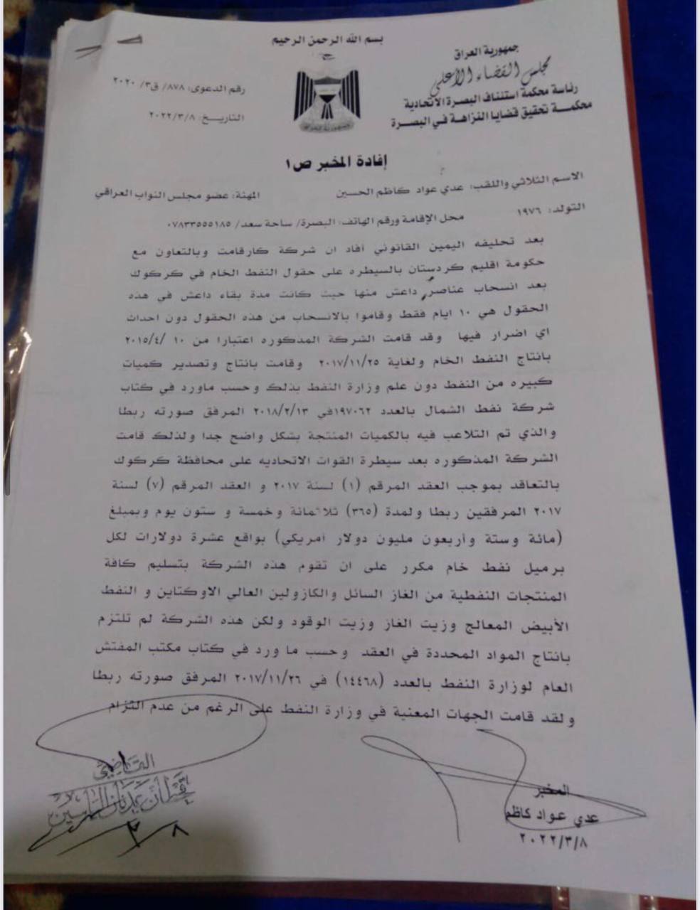 وأردف، أن "دائرة الدراسات والتخطيط بموجب كتابهم في 15 / 7 / 2018، بينت عدة ملاحظات على العقد المبرم مع هذه الشركة، ومنها عدم قانونية إعفائها من الضريبة والرسوم، وبعد انتهاء مدة العقدين الوارد ذكرهما أعلاه، كررت وزارة النفط إبرام العقد المرقم 1 لسنة 2018 المرفق ربطاً، مع نفس الشركة، مع زيادة في كميات النفط الخام المسلّم إليها، حيث بلغ مئة ألف برميل في اليوم، ولقد كررت هذه الشركة نفس المخالفات السابقة".
