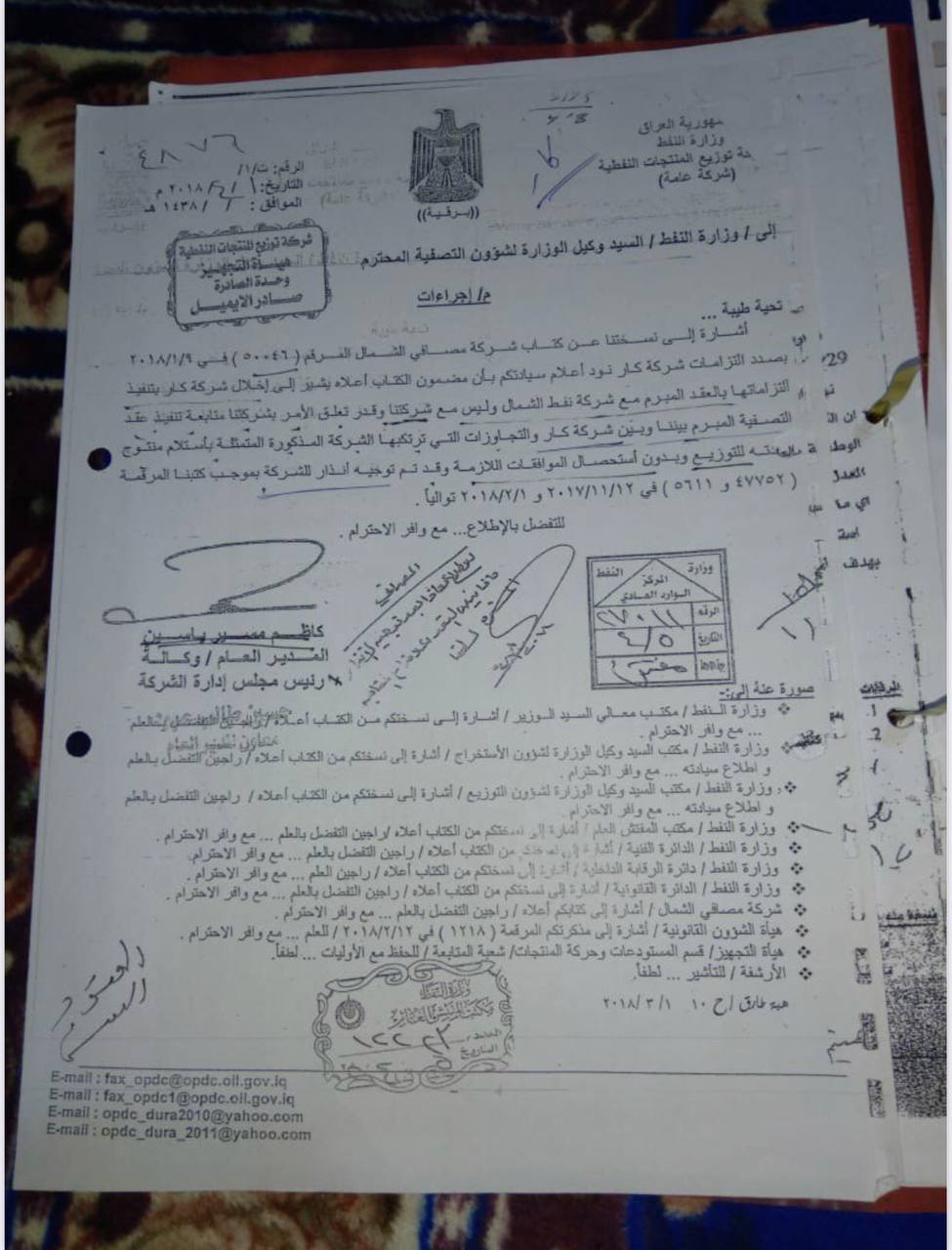 شركة توزيع المنتجات النفطية، بينت قيام شركة كار بعدة تجاوزات، ومنها المتاجرة بمنتوج تعود ملكيته للوزارة دون استحصال الموافقات الأصولية، وتم توجيه إنذارين لهذه الشركة بموجب كتاب صدر في 1 / 4 / 2018، المرفق ربطاً، ولقد وجه مكتب