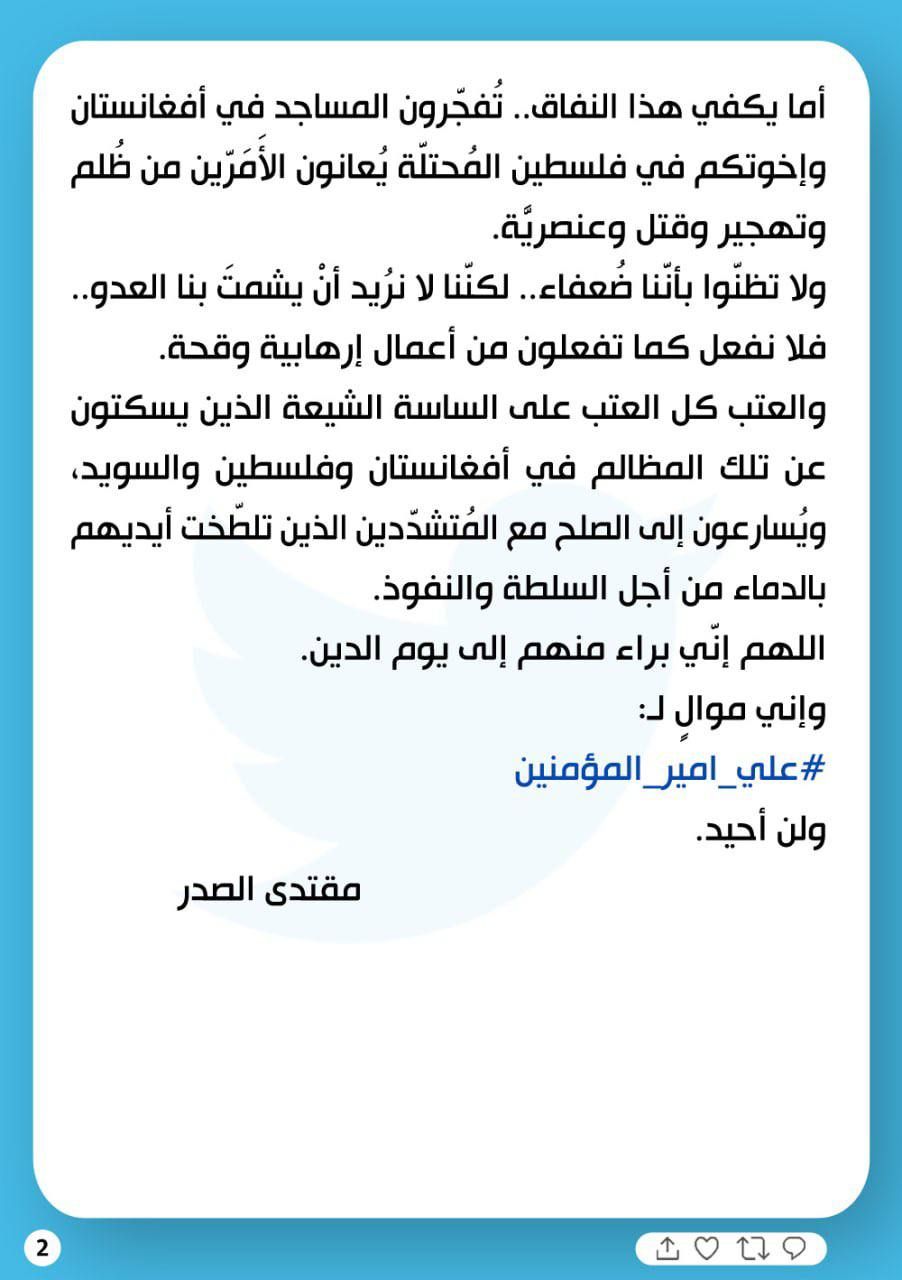 تغريدة هامة من الصدر بشأن استهداف المساجد في افغانستان - عاجل